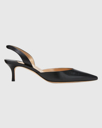 - Manolo Blahnik kid leather pump. - Available in multiple colors. - 2" covered heel. - Pointed toe. - Slingback strap with stretch inset. - Calf leather lining. - Smooth outsole. - "Carolyne" is handmade in Italy. - Size Note: Item runs small, consider ordering a size up.