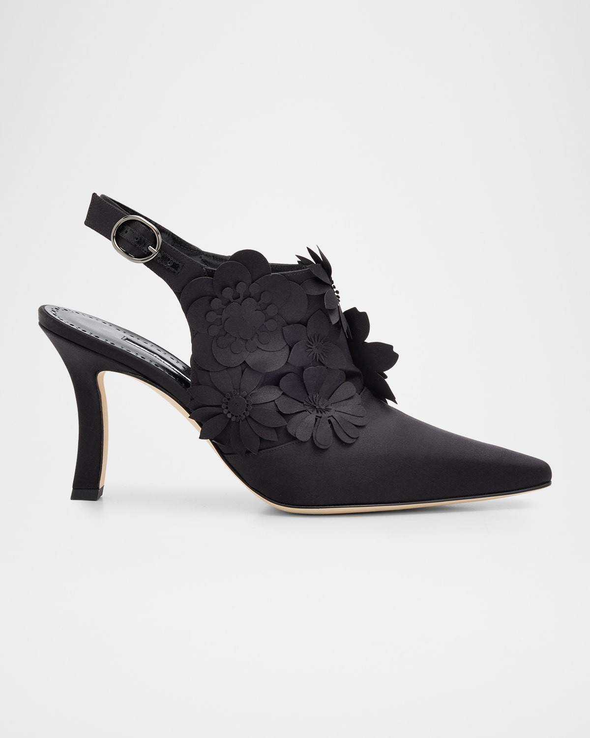 - Accentuated by 3D tonal florals, the "Antigonid" pumps by Manolo Blahnik are crafted from lustrous crepe silk - 3.50 in / 90 mm covered stiletto heel - Pointed toe - Adjustable slingback strap - Goat leather lining - Leather outsole - Made in Italy