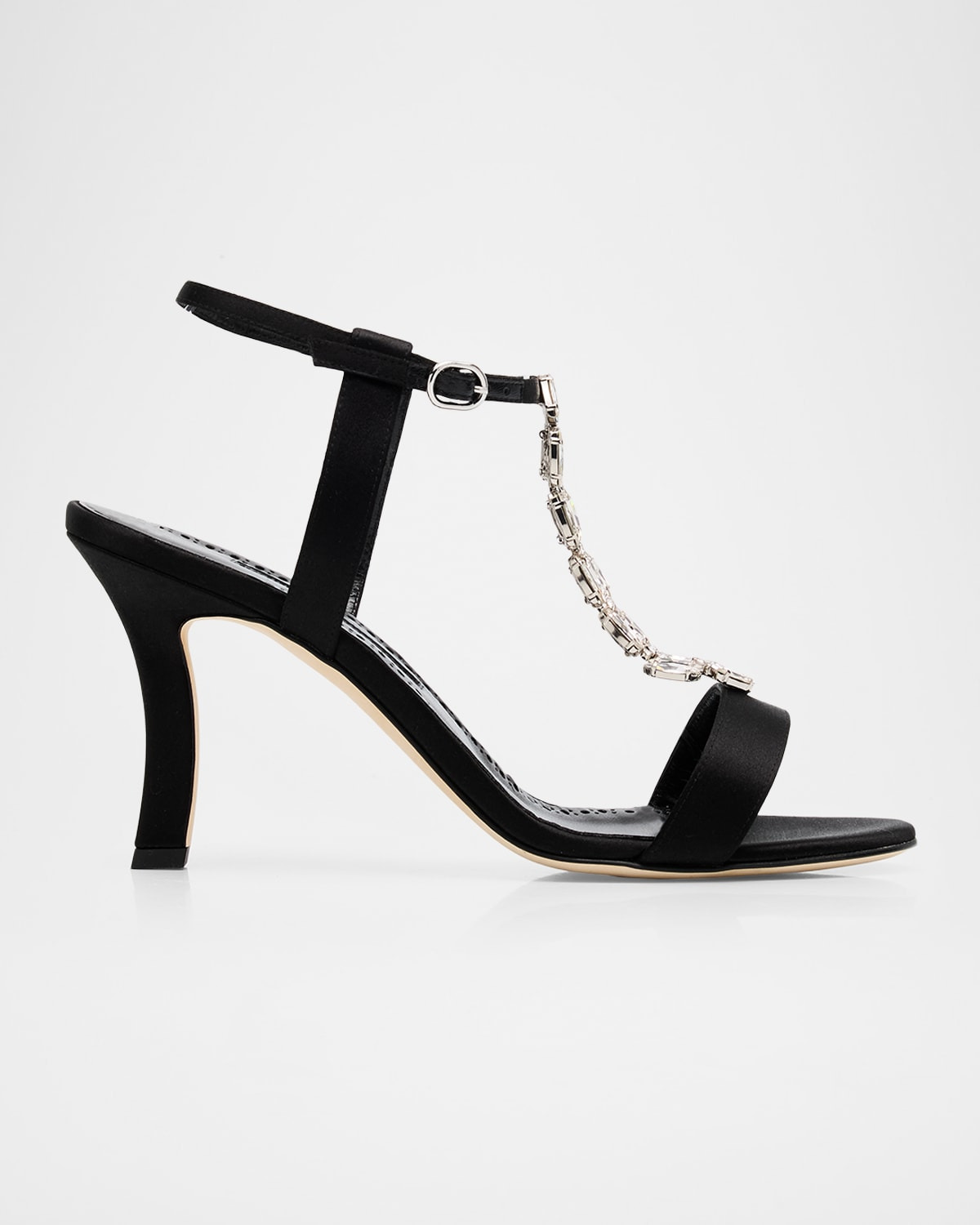 - Adorned with a mixed crystal-embellished T-strap, the Molasan sandals by Manolo Blahnik are crafted from lustrous satin - 3.50 in / 90 mm covered stiletto heel - Open toe - Buckle ankle strap - Upper: Viscose/silk - Goat leather lining - Leather outsole - Made in Italy