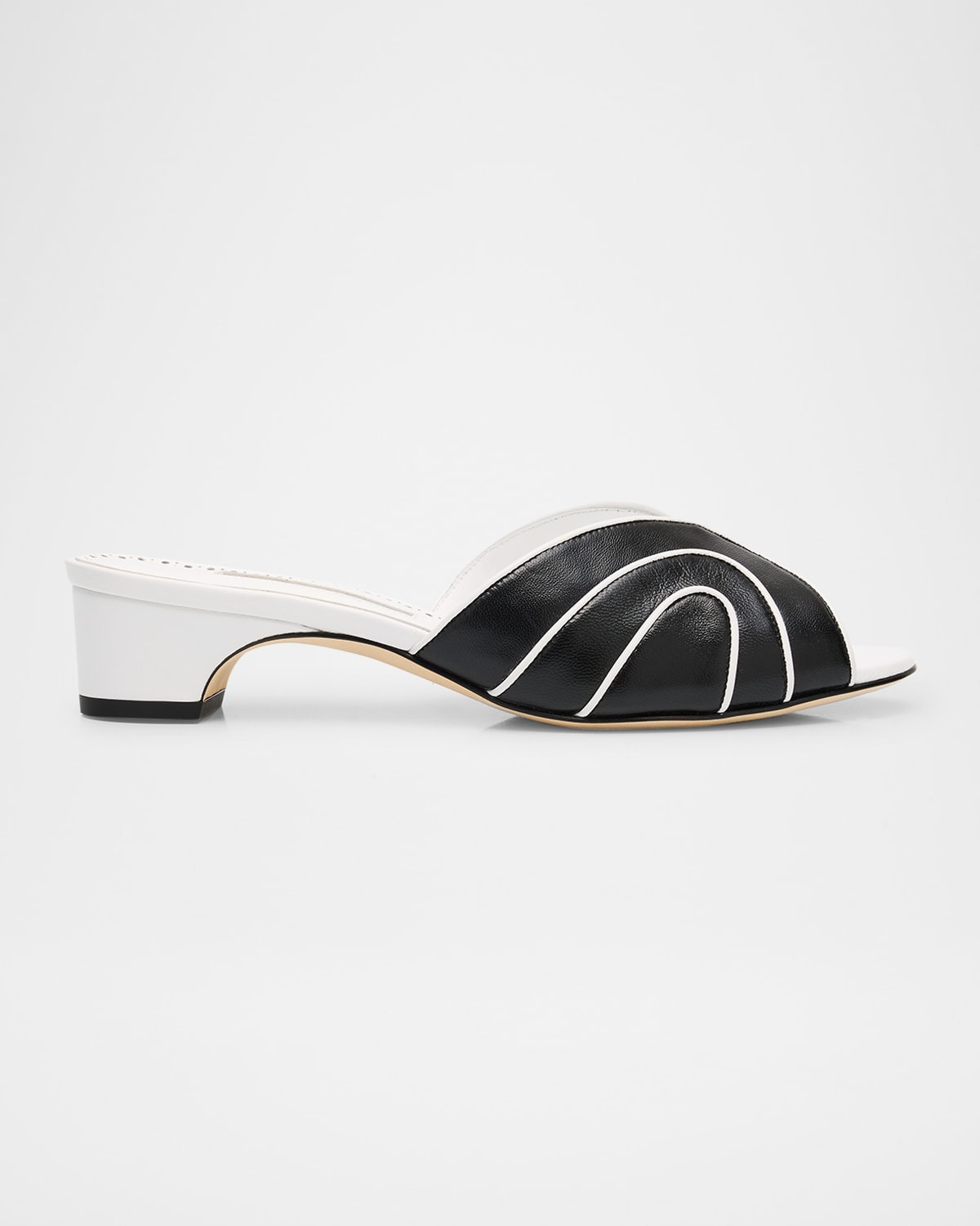 - Manolo Blahnik "Nikabo" nappa leather sandals - 1.25 in / 30 mm block heel - Peep toe - Slip-on style - Leather outsole - Lining: Goat leather - Made in Italy