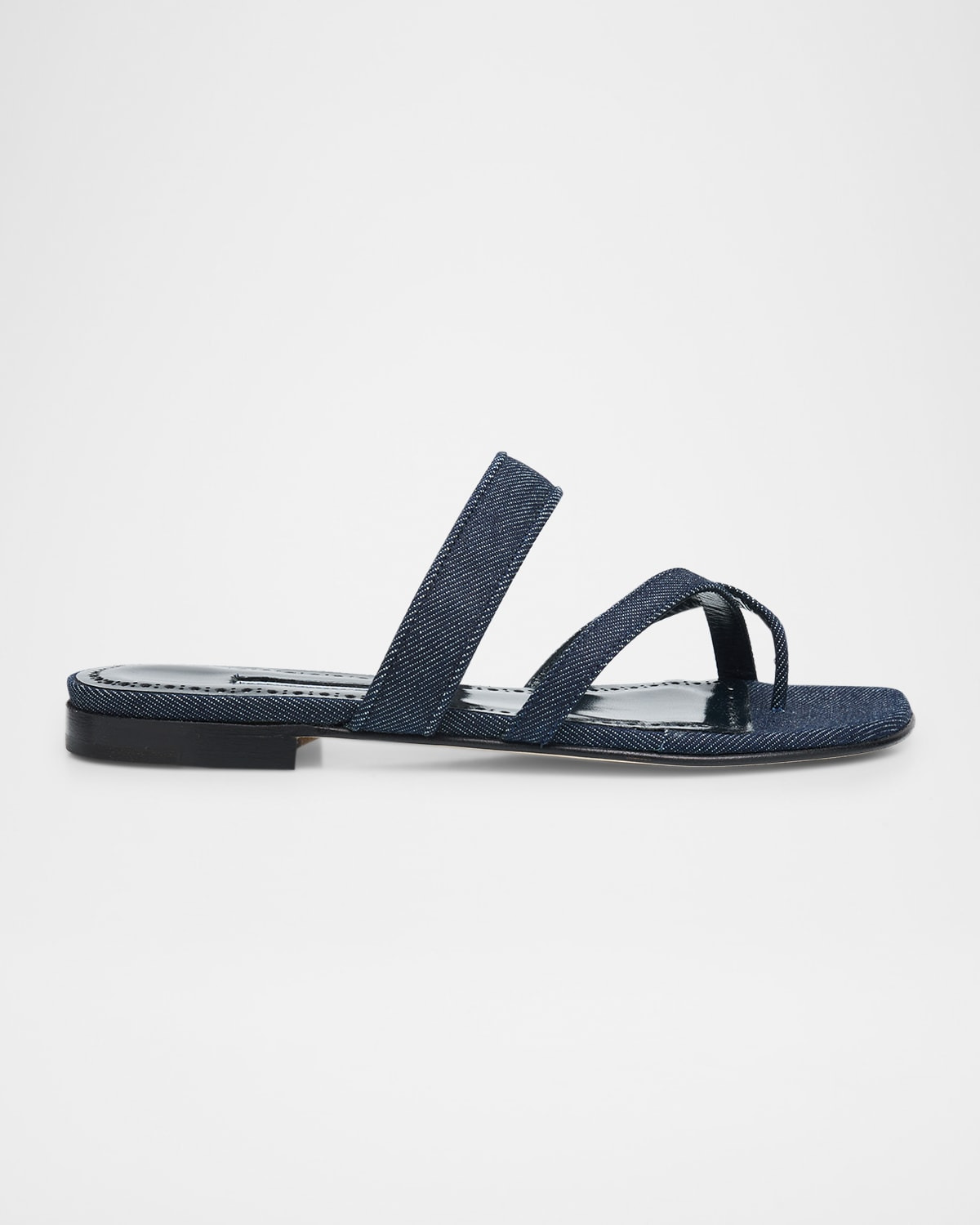 - Manolo Blahnik "Susa" cotton chambray sandals - 0.25 in / 10 mm flat heel - Thong strap with crisscross bands over vamp - Thick strap across upper - Slide style - Leather outsole - Lining: Goat leather - Made in Italy