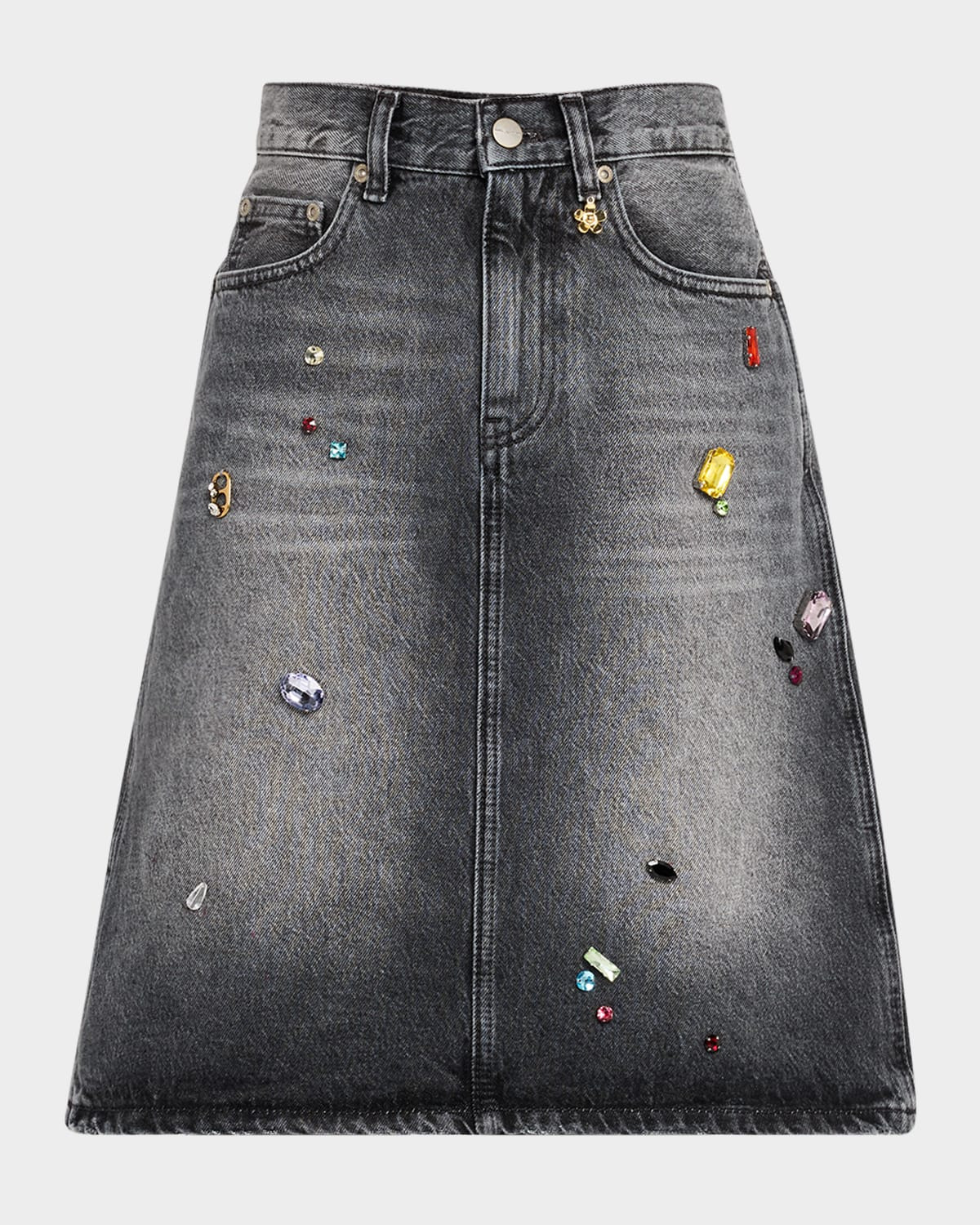 Marc Jacobs graywashed denim skirt embellished with charm embroidery and signature M back pockets Mid waist Fivepocket style Logo patch back Knee length Aline silhouette Button/zip fly; belt loops Cotton Imported