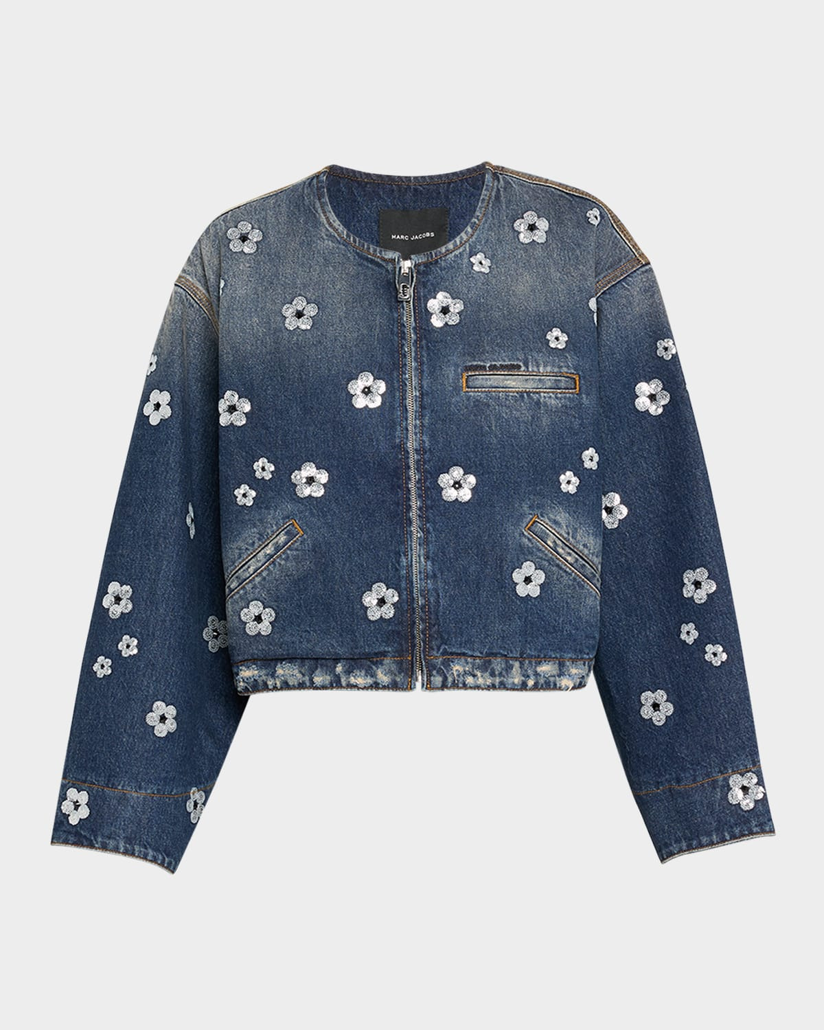 Marc Jacobs distressed denim collarless jacket featuring daisy sequin embroidery Round neckline; zip front Long sleeves; approx. 22.6"L Front welt pockets Back logo patch Relaxed fit Cropped length Cotton Made in Italy