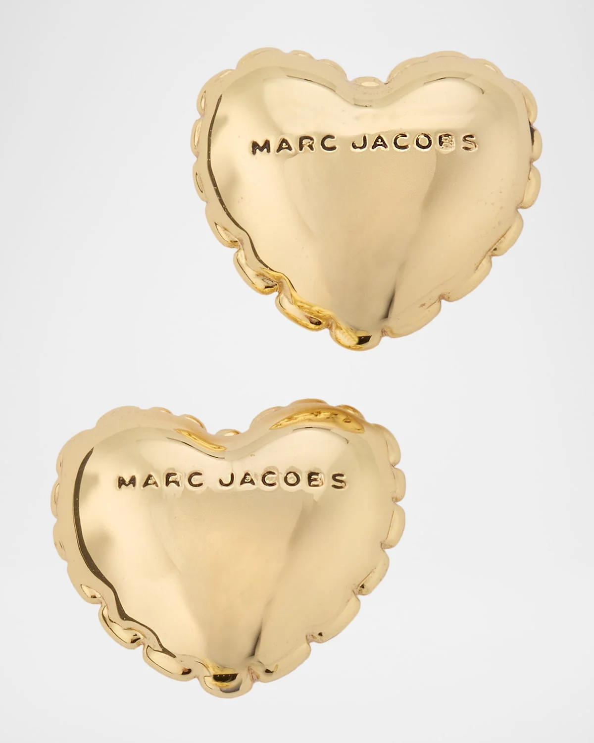 A domed design defines these shiny heartshaped studs by Marc Jacobs. Approx. 10mm diameter Polished goldtone brass Engraved logo text For pierced ears Imported