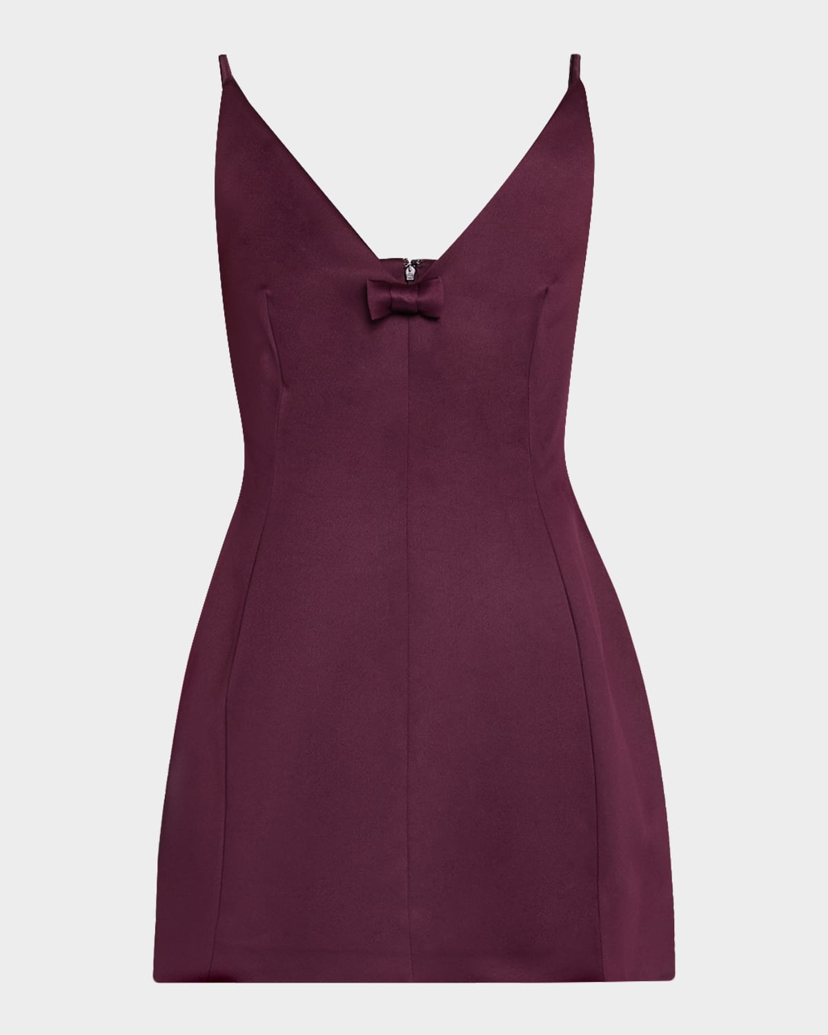 Marc Jacobs structured satin dress adorned with a tonal centerfront bow V neckline Fixed spaghetti straps Side seam pockets Hem falls above the knee Aline silhouette Invisible back zipper Polyester Lining: Polyester Dry clean Imported
