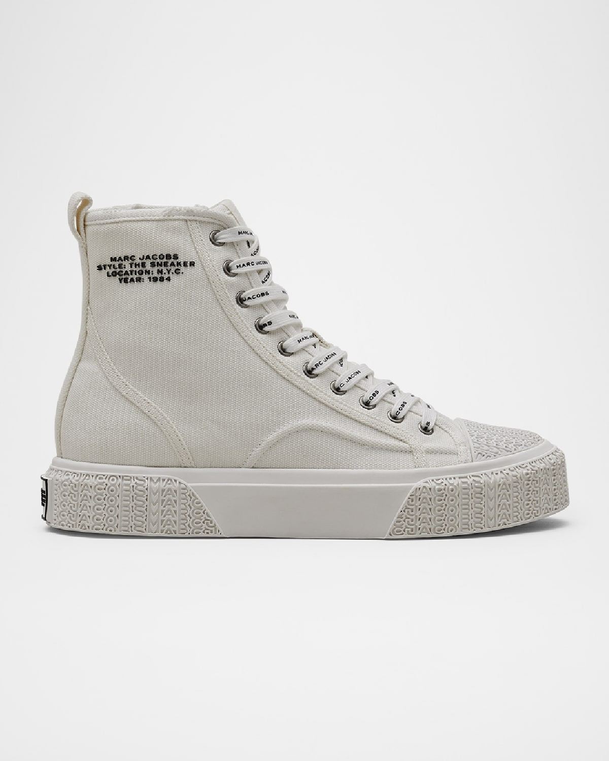 - Marc Jacobs high-top sneakers in solid canvas and EVA with raised logo on collar - 1.38 in / 35 mm flat heel - Round logo embossed cap toe - Lace-up vamp with logo laces - Pull tab at the backstay - Embossed logo on midsole - Rubber outsole - Imported