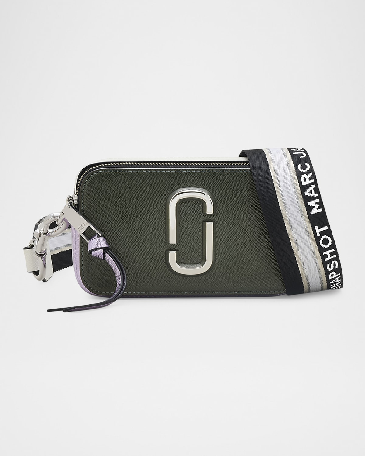 - Marc Jacobs "The Snapshot" crossbody bag in calf leather - Features signature double J monogram - Detachable, adjustable branded web crossbody strap, 26.8"L - Double zip top closure - Exterior, back slip pocket - Interior, one slip pocket - Lining: Polyester - Approx. 4.1"H x 7.1"W x 2.4"D - Imported
