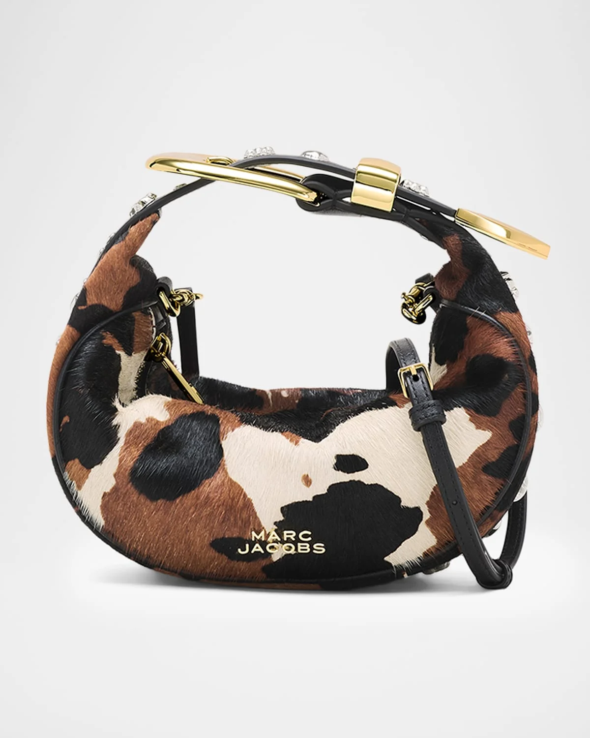 Designed in a rounded silhouette, this scrunched Marc Jacobs crossbody bag is crafted in dyed calf hair (Philippines), decorated with a bold cowprint The westerninspired handle is detailed with Mini Icon accents and an exaggerated buckle Flat top handle Detachable, adjustable crossbody strap, 21" drop Can be worn as a top handle or crossbody bag Zip top closure Faille lining (polyester) Approx. 8"H x 12"W x 3"D Imported Dust bag included