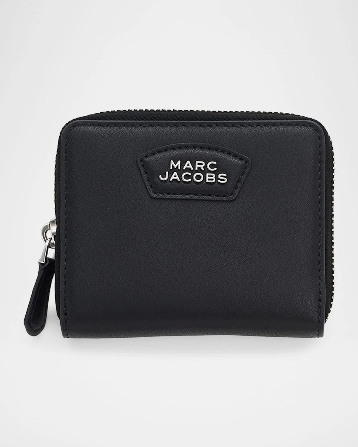 This Marc Jacobs wallet is crafted in smooth leather with polished metal logo lettering and a functional, organized interior Zip top closure Exterior, back zip pocket Interior, four card slots, one bill compartment, one snap coin pouch Polyester twill lining Approx. 4"H x 4"W x 1"D Imported Dust bag included