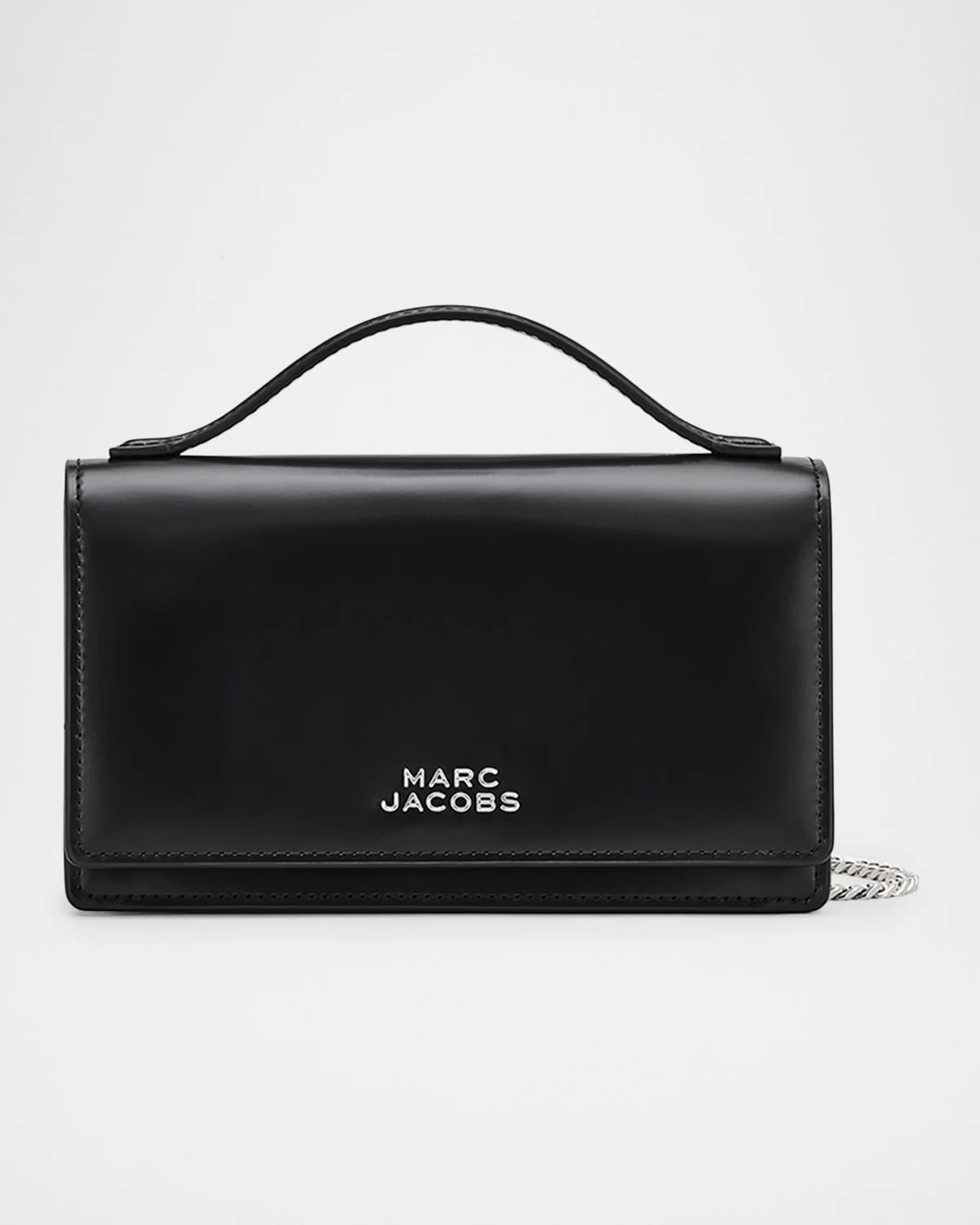 This Marc Jacobs crossbody bag is sleek and structured, crafted from glossy Spazzolato leather with metallic logo lettering Integrated daisyshaped mirror under the flap Flat top handle Detachable chain crossbody strap Can be worn as a top handle or crossbody bag Flap top with magnetic closure Interior, one zip pocket, one card slot Faille lining (polyester) Approx. 4"H x 8"W x 2"D Imported Dust bag included