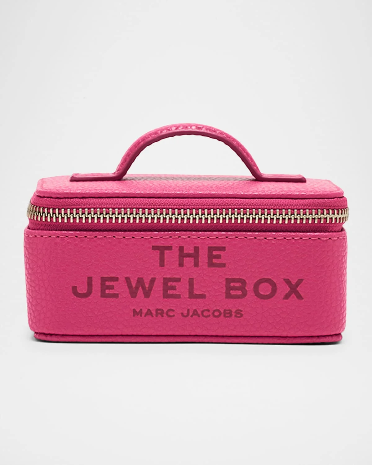 Crafted in pebble leather, this Marc Jacobs jewelry box is compact and functional, with distinct inner compartments and a builtin mirror Flat top handle Zip top closure Interior, five compartments, one elastic pocket Polyester twill lining Approx. 2"H x 5"W x 4"D Imported
