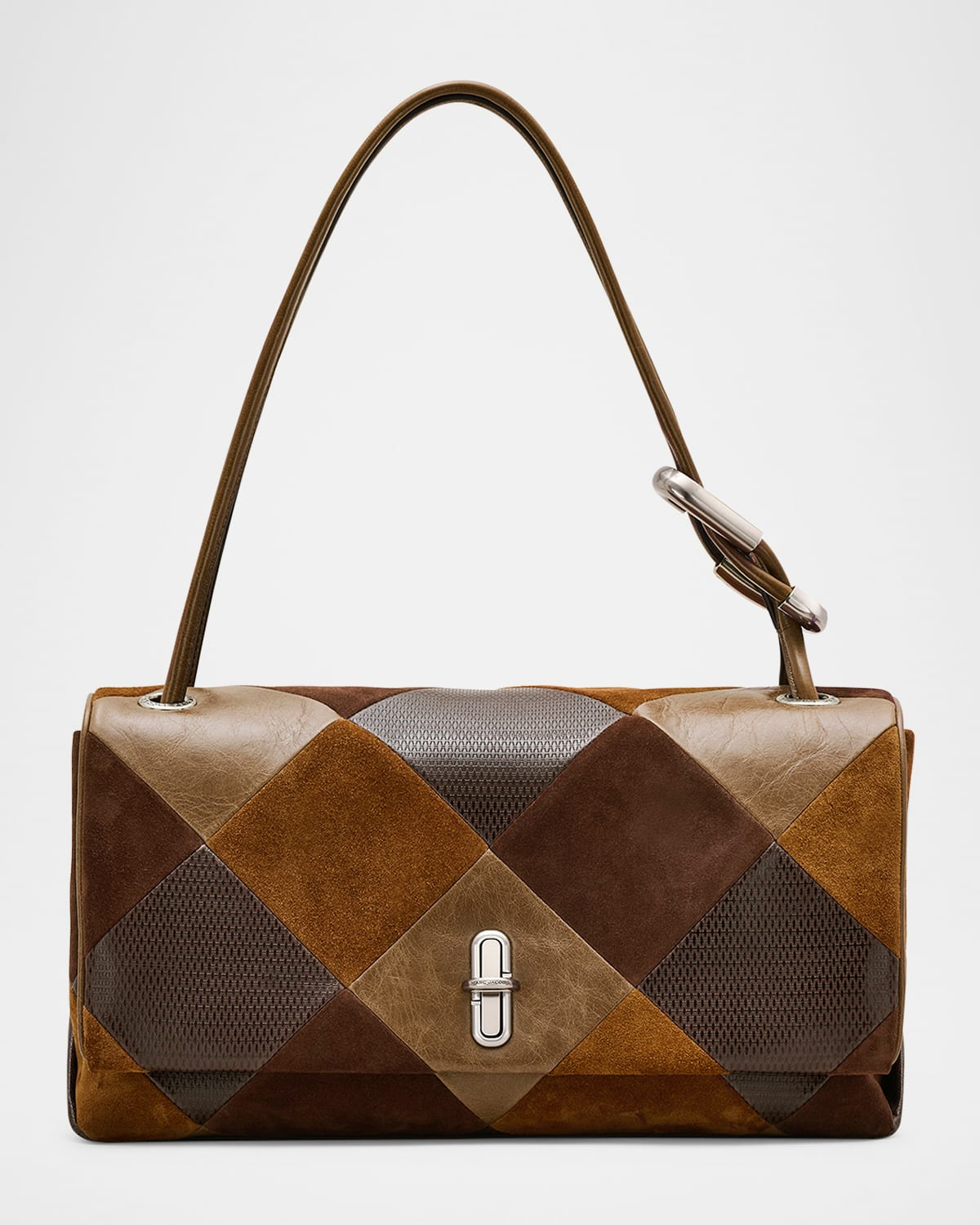 - Marc Jacobs "The Dual" shoulder bag in patchwork calf suede and leather - Shoulder strap with link accent; 11.2" drop - Interior, one zip pocket - Flap top with runway turn-lock closure - Cotton lining - Approx. 7.1"H x 13.8"W x 6.9"D - Spot clean - Imported