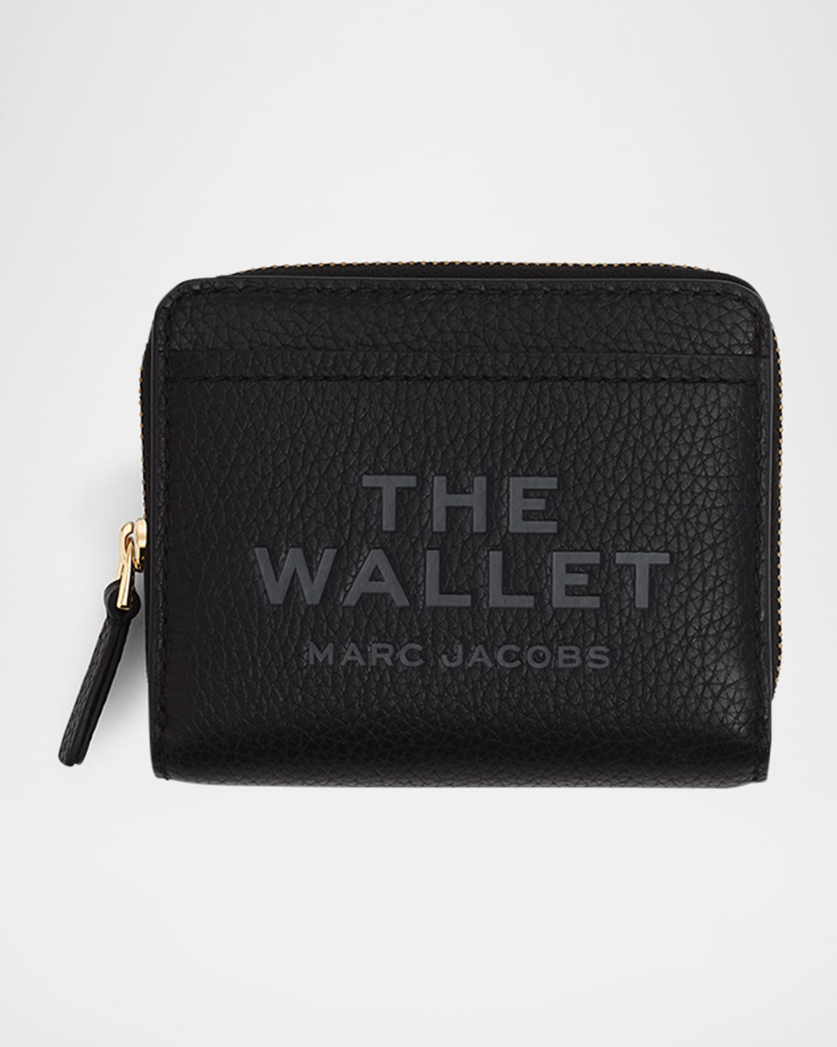 - Marc Jacobs compact wallet in leather - Bifold construction; snap closure - Exterior, zip pouch and two slip pockets - Interior, one bill compartment and four card slots - Approx. 3.7"H x 4.3"D - Imported