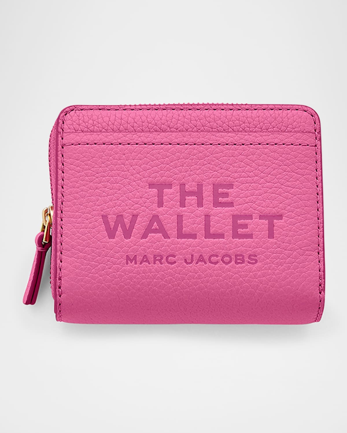 - Marc Jacobs compact wallet in leather - Bifold construction; snap closure - Exterior, zip pouch and two slip pockets - Interior, one bill compartment and four card slots - Approx. 3.7"H x 4.3"D - Imported
