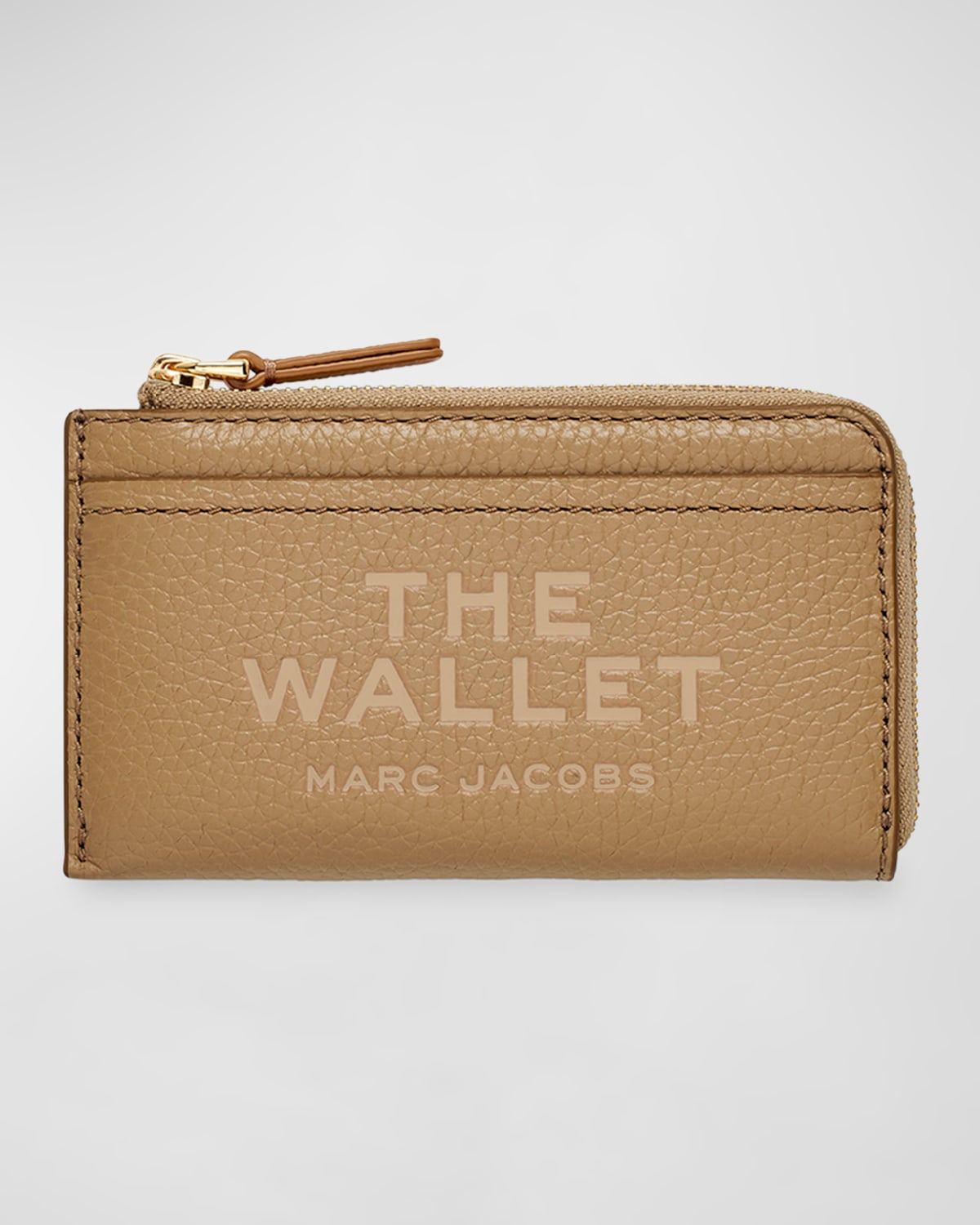 - Marc Jacobs leather wallet with logo accent - Zip top closure - Exterior, one slip pocket, four card slots, and D-ring keychain strap - Approx. 3"H x 5.1"W - Imported