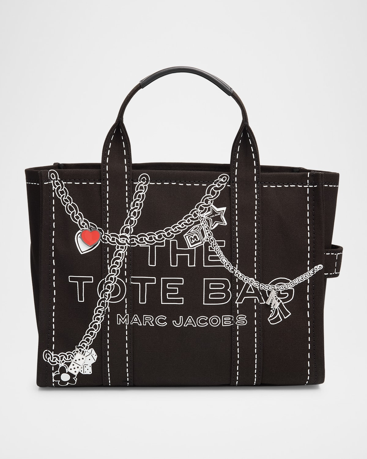 - This iconic signature Marc Jacobs roomy tote bag is structured in cotton canvas and combines a Trompe L'oeil chain print with attached hanging heart, domino, and Kiki heel charms - Flat top handles, 4.7" drop - Detachable, adjustable crossbody strap - Can be worn as a top handle or crossbody bag - Zip top closure - Interior, one zip pocket - Lining: Polyester - Approx. 10"H x 13"W x 5.9"D - Imported