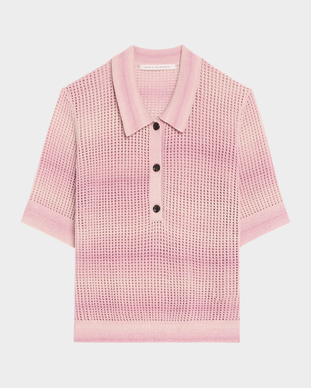 - MARIA MCMANUS shrunken polo in space dyed mesh knit - Point collar; three-button front - Short sleeves - Relaxed fit - Ribbed cuffs and hem - Cashmere/organic cotton - Imported