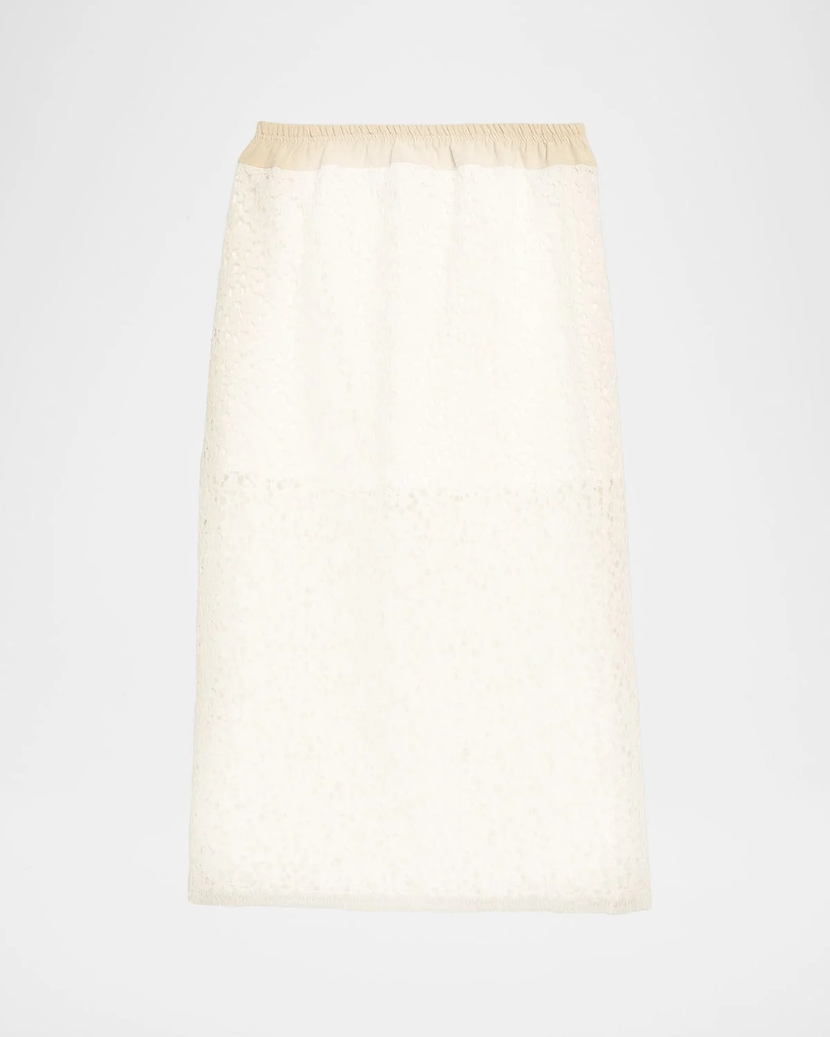 MARIA MCMANUS & nbsp;skirt designed with intricate lace detailing and ruching Sits high on the waist Hem hits around the knee Pencil & nbsp;silhouette Slit Length (inches): 13 3/4 Cotton/viscose Made in USA from imported materials