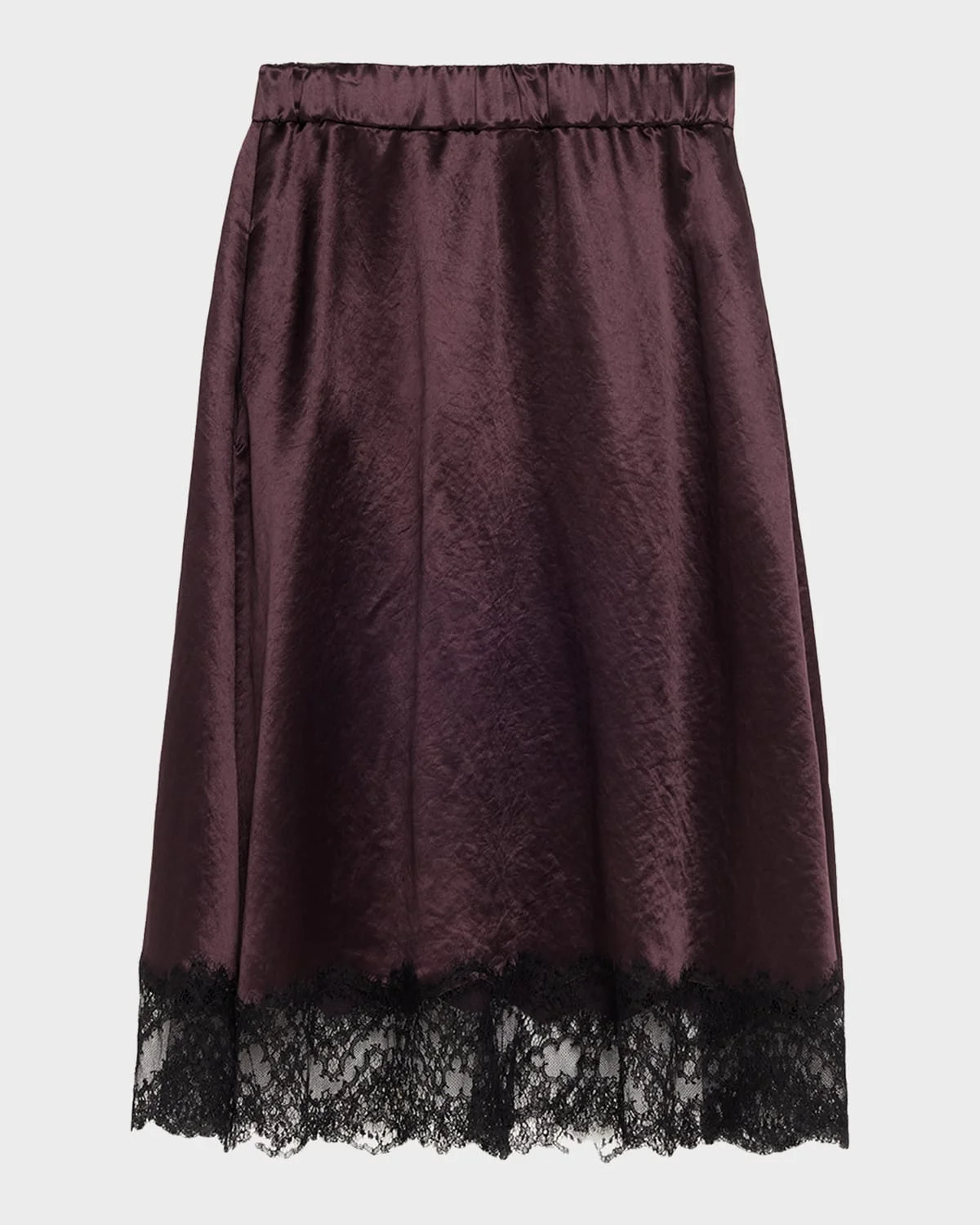 Crafted from lustrous satin, this circle skirt from MARIA MCMANUS features an elasticized waistband and is & nbsp;adorned with contrast delicate lace along the hem High waist Elasticized waistband Circle silhouette Hem falls below the knee Scalloped hem Pull-on style Acetate Dry clean Made in USA from imported materials