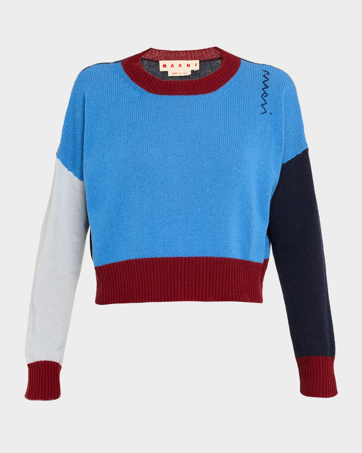 - Marni colorblock sweater featuring a handmade embroidered logo on front left side - Crew neckline - Long sleeves - Drop shoulders - Boxy fit - Ribbed cuffs and hem - Pullover style - Cashmere - Dry clean - Made in Italy
