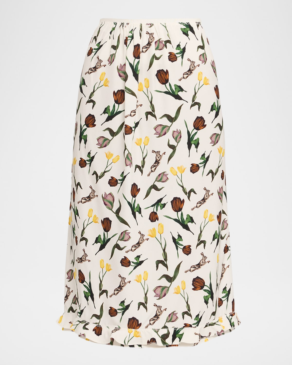 CREAM ENVERS SATIN MIDI SKIRT WITH TULIPS AND HARES PRINT
