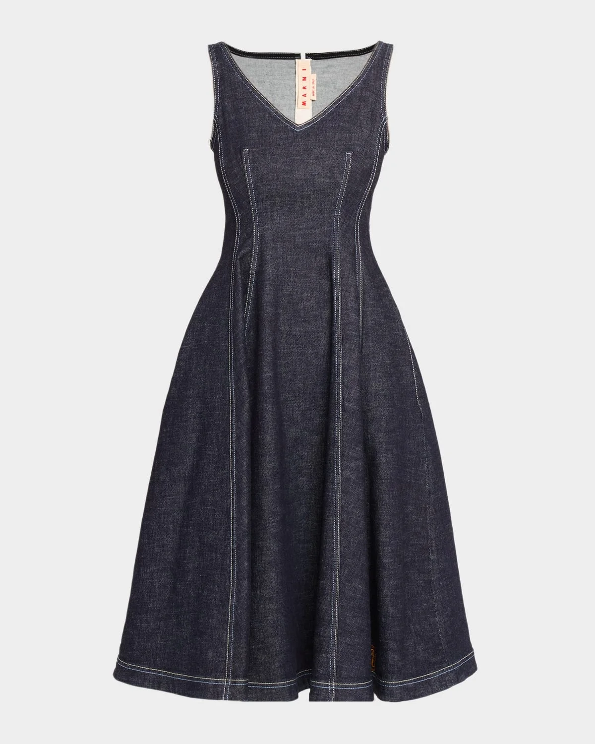 Crafted from dark-washed stretch denim, this dress from Marni features contrast topstitching and a & nbsp;log embroidered on the hem V neckline Sleeveless A-line silhouette Hem falls below the knee Back zip Cotton/elastane Dry clean Made in Italy SIZE & FITModel measurements: 5 & apos;10" tallModel is wearing a US size 4/Small