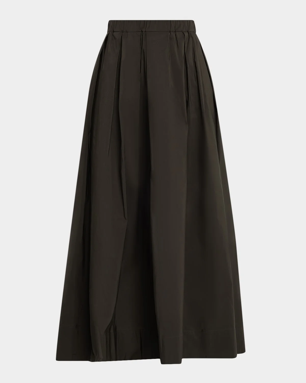 Voluminous pleated Max Mara skirt in micro faille with a soft sheen for a full statement silhouette Pleats fall from the elasticized waist Onseam pockets Hem falls to the ankle Aline silhouette Cotton/polyester Dry clean Made in Romania