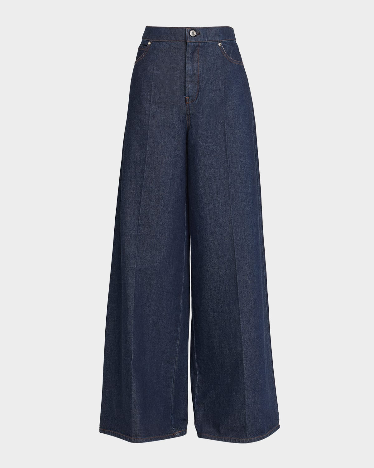 - Max Mara "Carmine" trousers in a dark wash denim with a leather logo patch on the back - High rise - Five-pocket style - Wide legs - Full length - Button/zip fly - Cotton - Dry clean - Imported