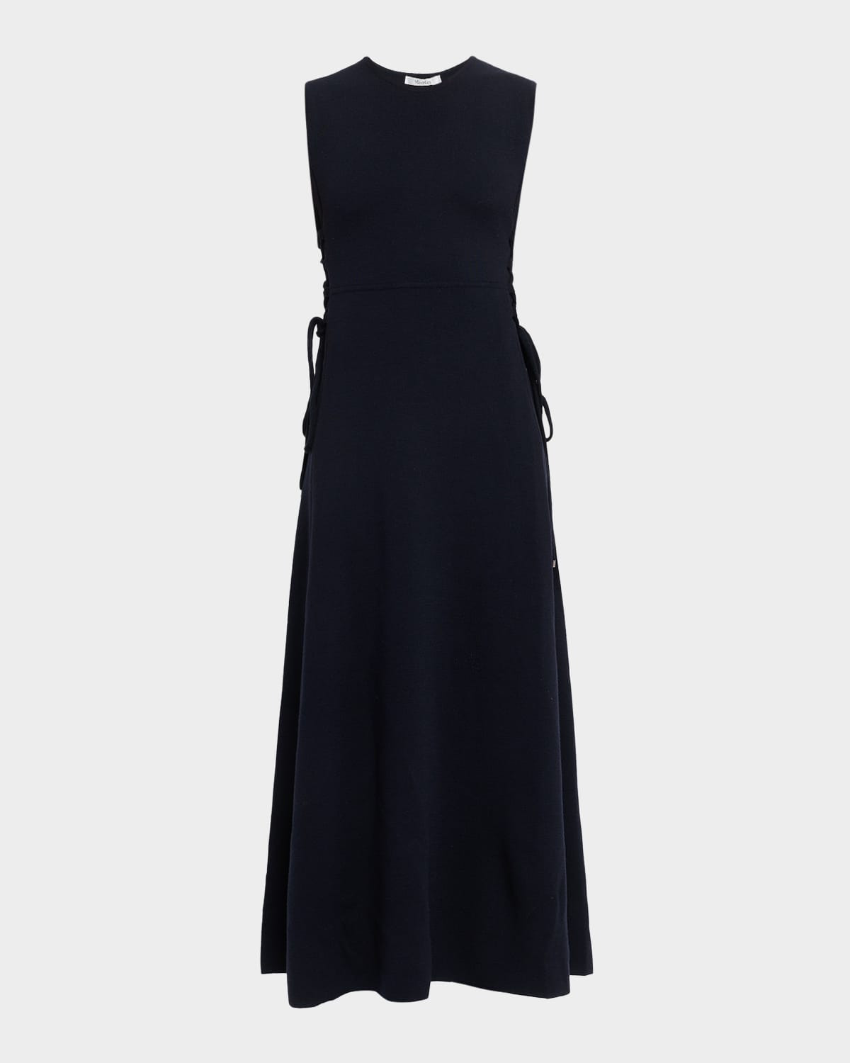 - The "Delfi" midi dress from Max Mara is knit in a soft and fluid wool, detailed with lace-up side drawstrings for a cinched figure - Jewel neckline - Sleeveless - Hem falls below the knee - A-line silhouette - Slipover style - Virgin wool - Hand wash or dry clean - Made in Italy