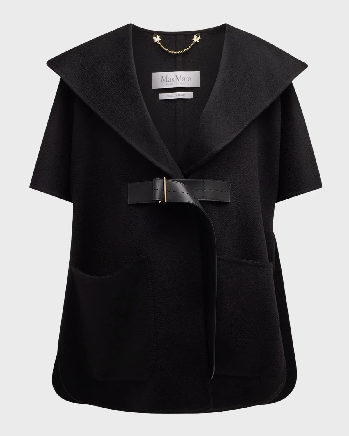 Max Mara "Dorico" hooded cape in cashmere and calf leather Short sleeves Buckle closure Deep slip pockets Hem rests below the hips Professionally dry clean Made in Italy