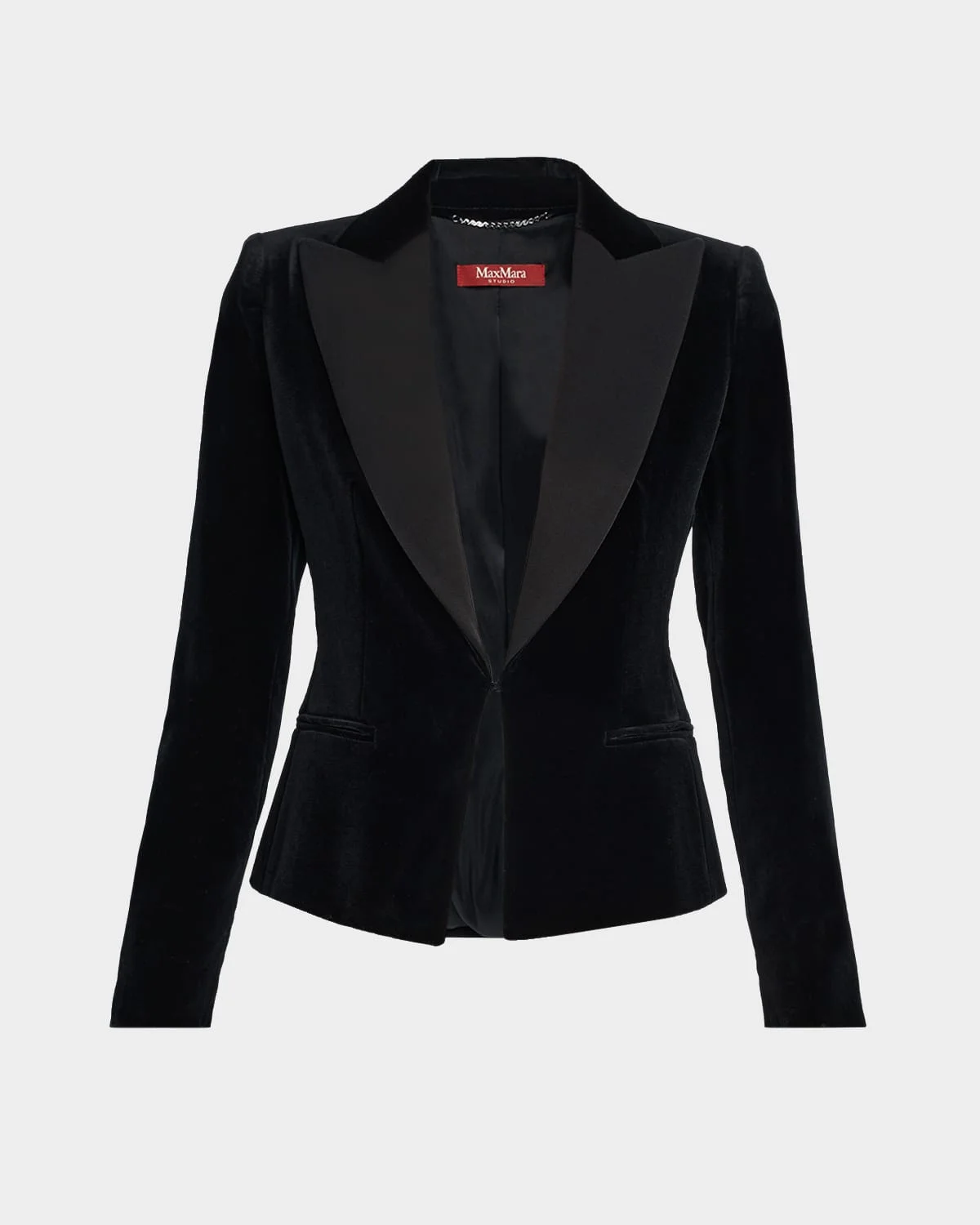 This "Eolie" tuxedostyle jacket from Max Mara is designed in smooth stretch cotton velvet with enver satin lapels Peak lapels; hookandeye front Long sleeves Threebutton cuffs Hip welt pockets Tailored fit Cotton/elastane/acetate Dry clean Made in Poland
