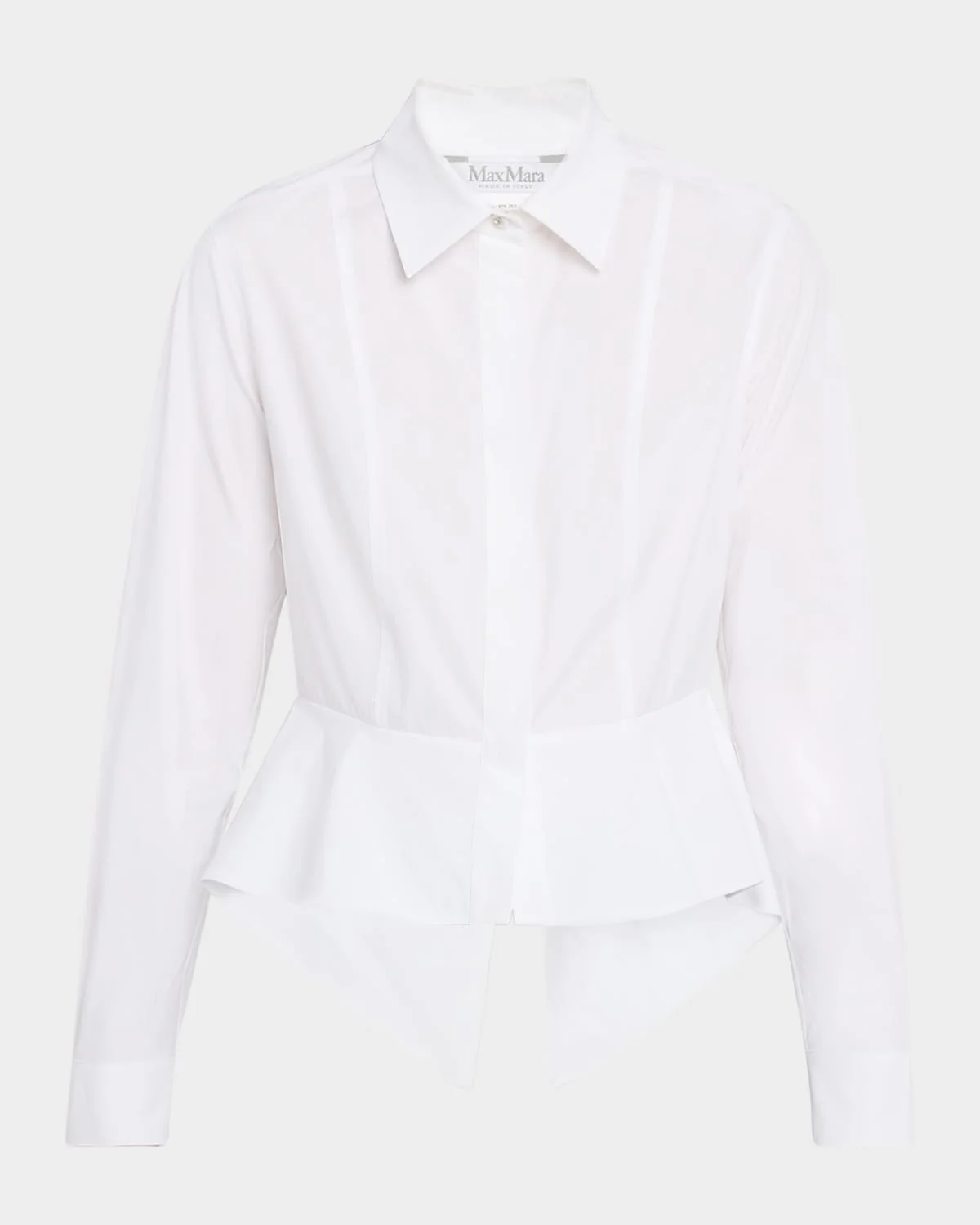 - Max Mara "Gamma" shirt featuring a high-low peplum with a handkerchief back hem - Point collar; concealed button front - Long sleeves; button cuffs - Slim fit - Flounce hem - Cotton/elastane - Machine wash cold - Made in Italy