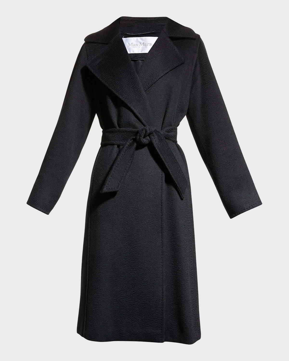 Maxmara "Manuela" camel hair wrap coat. Approx. length: 115 cm. Spread collar; one button closure. Long sleeves. Side seam pockets. Selftie belt. Relaxed fit. Midi length. Vented back. Camel wool. Professionally dry clean perchloroethylene mild process; do not wet clean. Made in Italy.