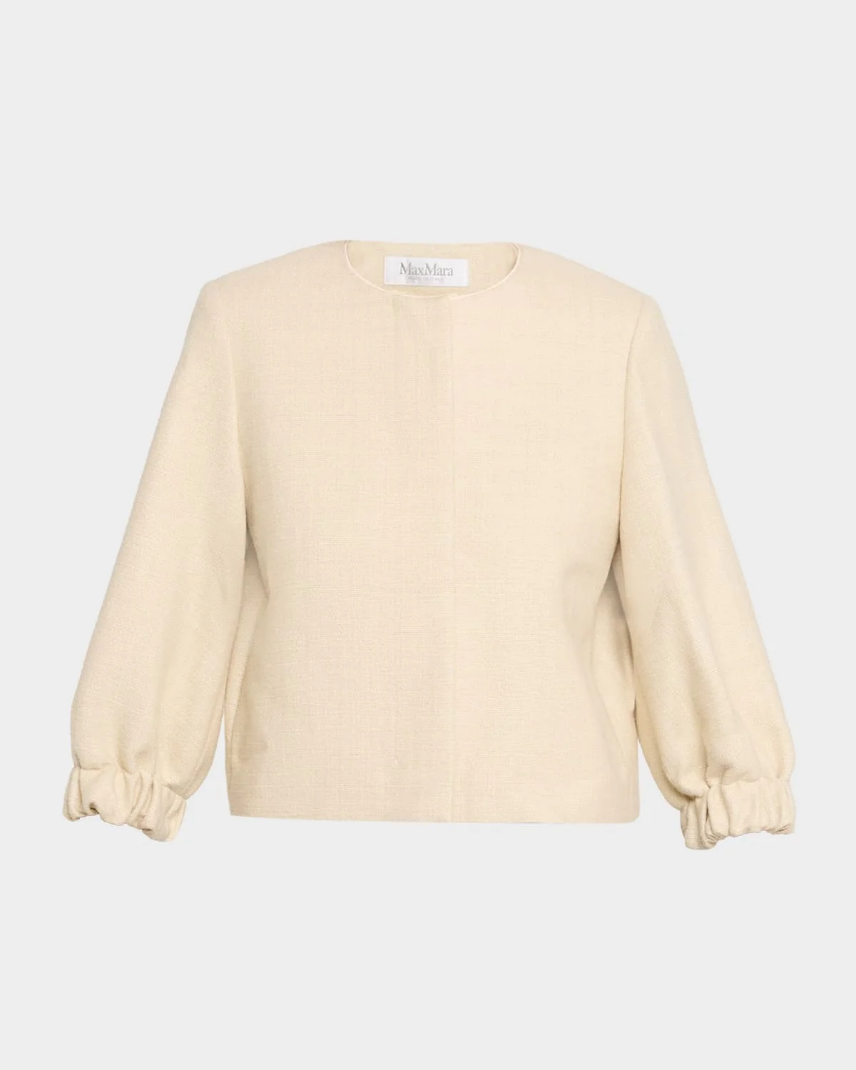 - The Max Mara "Naiadi" textured jacket is a refined layering piece designed with softly gathered sleeves for modern elegance. - Round neckline; single-breasted front - Long sleeves; elasticized cuffs - Side slip pockets - Boxy fit - Cropped length - Silk/virgin wool - Lining: Acetate/polyester - Dry clean - Made in Italy
