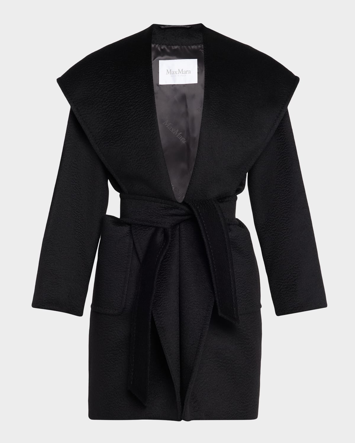 Maxmara "Rialto" coat in camel hair. Shawl collar; open front. Hooded back. Long sleeves. Selftie belt. Front patch pockets. Slim Aline silhouette. Midthigh length. Viscose lining. Made in Italy.