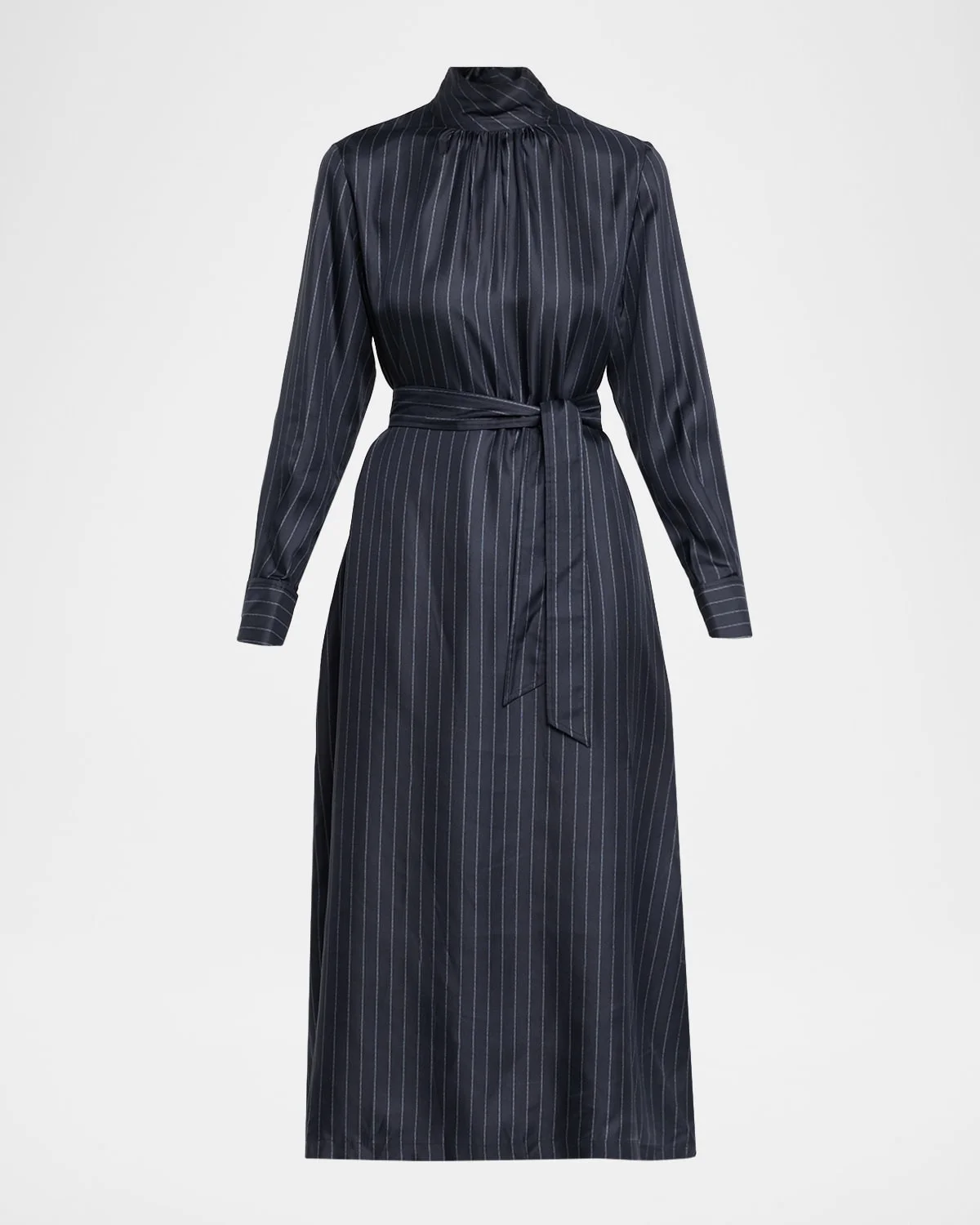 - Max Mara "Sabbia" loose and flowy silk midi dress with horizontal double pinstripes - Band collar; button front placket - Long blouson sleeves - Button cuffs - On-seam pockets - Side slit hem - Hem falls below the knee - Shift silhouette - Slipover style - Silk - Dry clean - Made in Italy