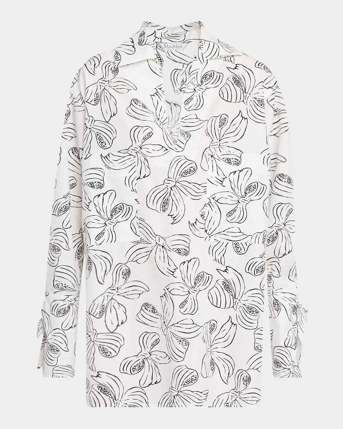 - Max Mara "Sansa" shirtdress featuring a bow print - Spread collar; split V front - Long sleeves; self-tie cuffs - Shift silhouette - Mini length - Slipover style - Cotton - Machine wash cold - Made in Italy