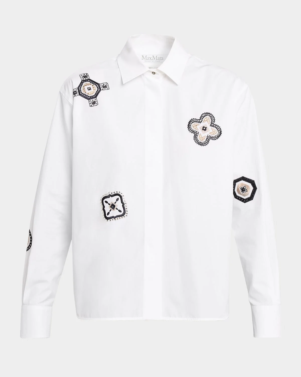 Max Mara & apos;s "Shock" shirt is cut from crisp cotton poplin decorated with rhinestone-embellished placed embroidery Spread collar Concealed button front Long sleeves Button cuffs Back yoke Rounded side slit hem Relaxed fit Cotton Dry clean, hand wash Made in Italy SIZE & FITModel measurements: 5 & apos;10" tallModel is wearing a US size 4/Small