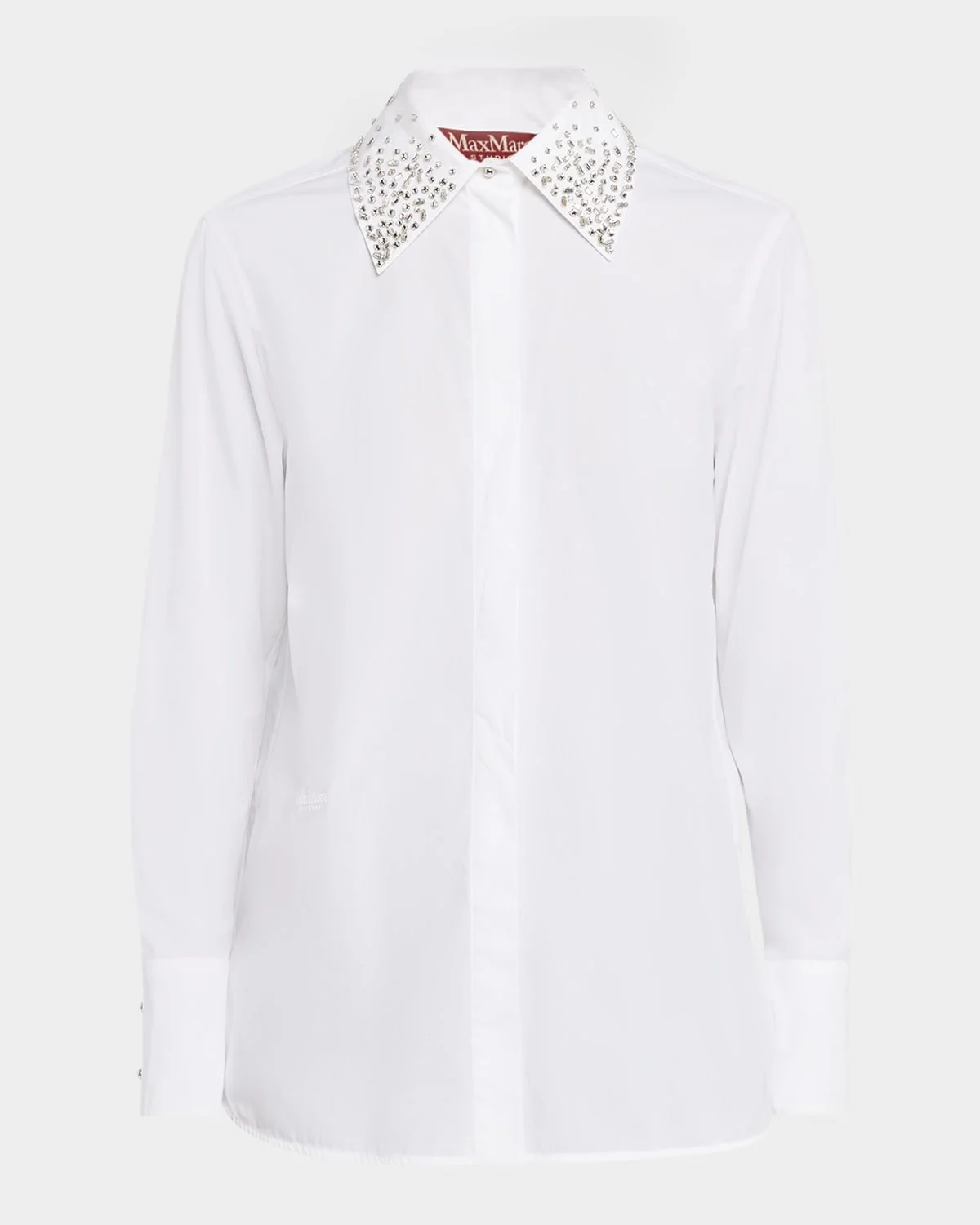 Sharp poplin Max Mara "Staffa" shirt with a crystalstudded collar and jewel buttons, turning classic tailoring into a statement piece Spread collar; placket conceals button front Long sleeves; twobutton cuffs Yoked, pleated back Logo on the front hem Shirttail hem with vented sides Straight cut with a relaxed fit Cotton Hand wash Imported