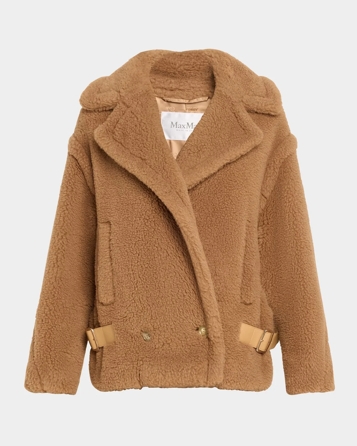 Max Mara "Vanadio" cozy camel wool overcoat with a calfskin leather belted hem Oversized notched collar Twobutton front Dropped shoulders Long sleeve Side welt pockets Midlength Wool/silk Trim: Leather Made in Italy
