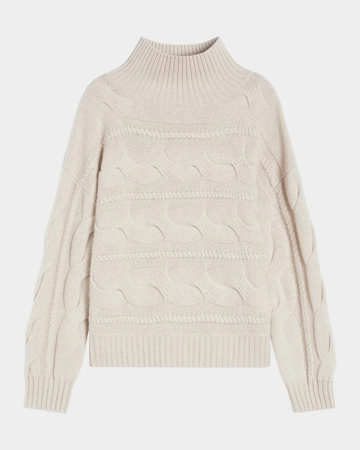 Max Mara "Vodka" sweater distinguished by signature horizontal cableknit detailing throughout High funnel neckline Long sleeves Ribbed cuffs and hem Relaxed fit Pullover style Wool/cashmere Hand wash Imported