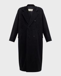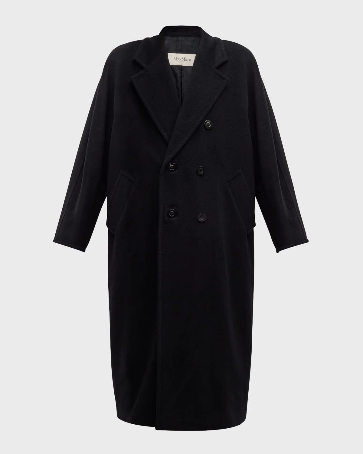 Maxmara Madame coat in woolcashmere blend. Notched lapel; double breasted button front. Long sleeves. Selftie sash at waist. Slim Aline silhouette. Midi length. Virgin wool/cashmere. Lining, cupro/viscose/metallic fiber. Made in Italy.