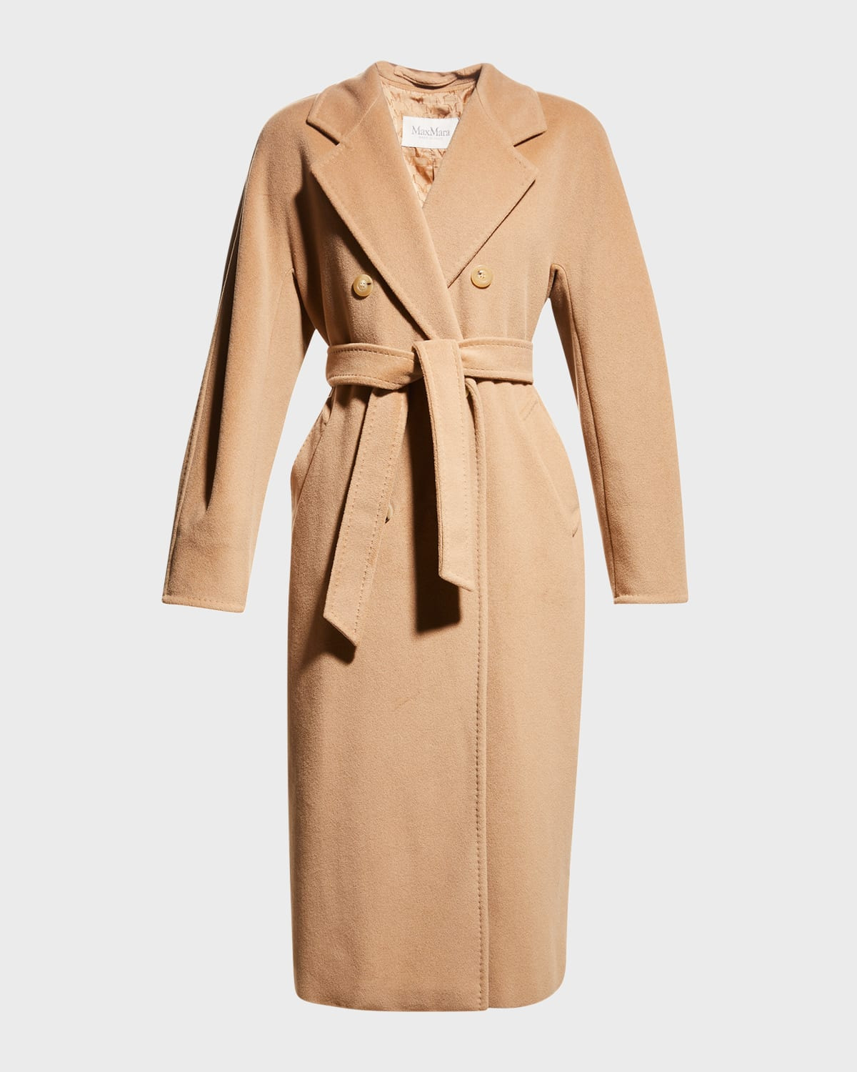 Maxmara "Madame" coat in wool cashmere blend. Notched lapel; double breasted button front. Long sleeves. Hip slip pockets. Trench fit. Virgin wool/cashmere. Lining, cupro/viscose/metallic fiber. Made in Italy.