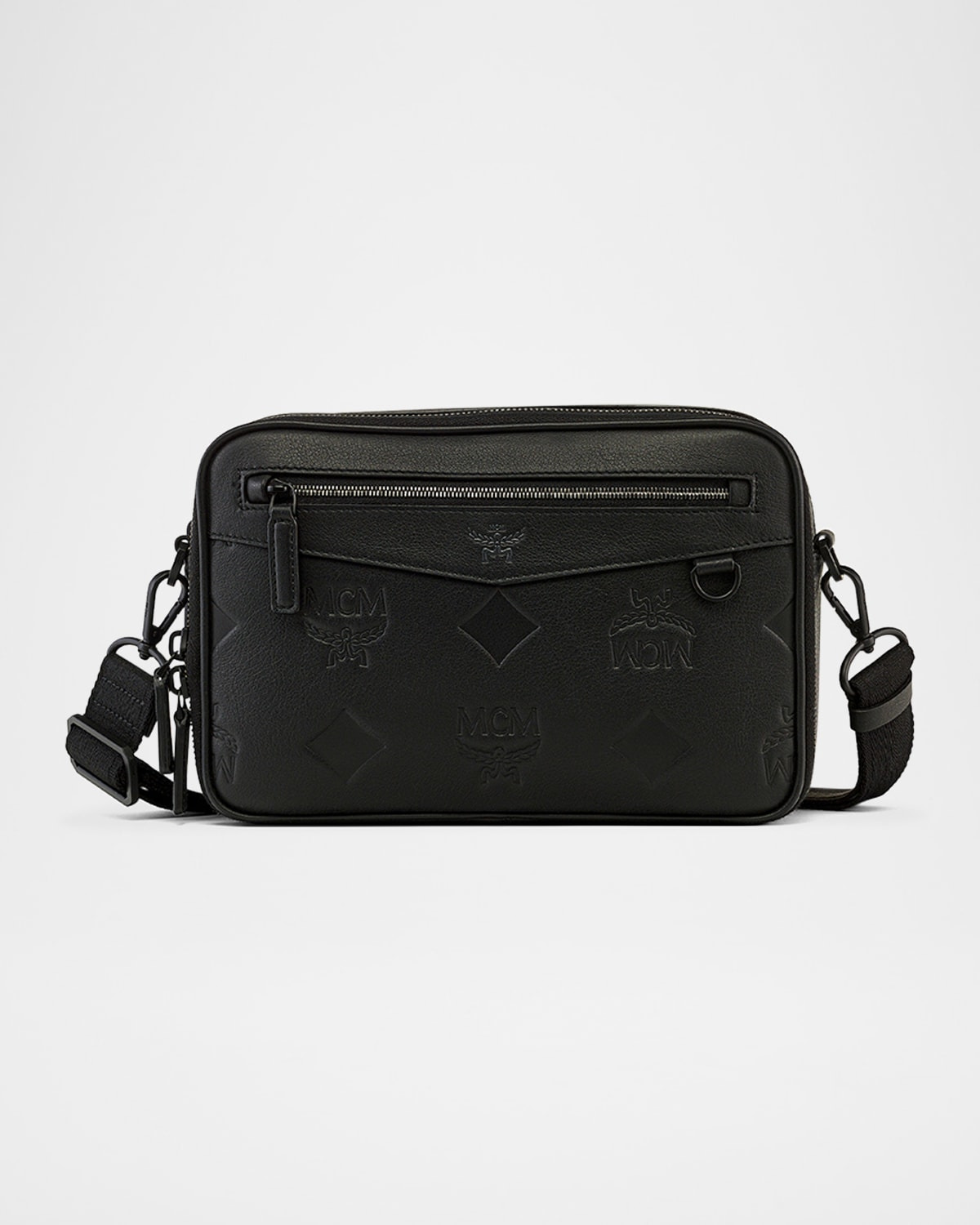 - MCM small crossbody bag in diamond embossed monogram napa leather - Adjustable detachable shoulder strap; 32-56.7"L - Zip closure - Exterior, one zip pocket - Cotton lining - Approx. 6.5"H x 9.4"W x 2.8"D - Imported