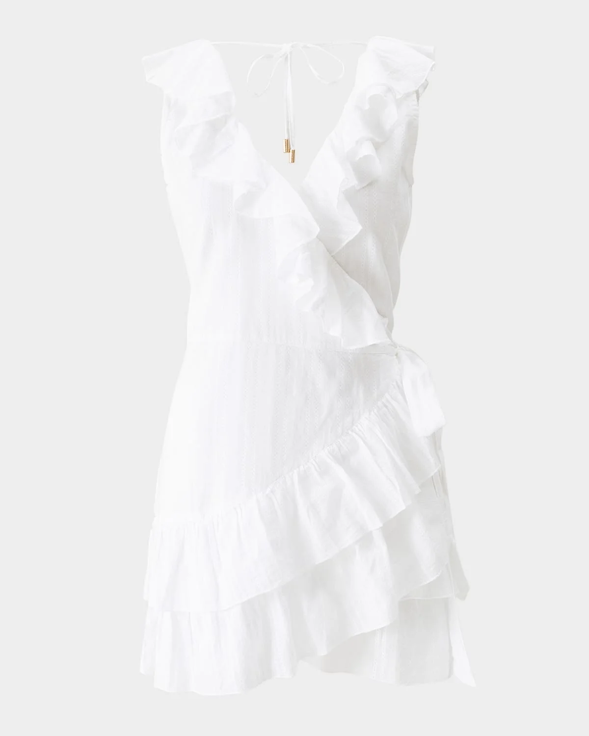 - Melissa Odabash "Molly" dress features a double layer skirt and feminine frill detailing - V neckline - Sleeveless - Hem falls above the knee - Wrap silhouette - Self-tie side closure - Cotton - Hand wash - Imported
