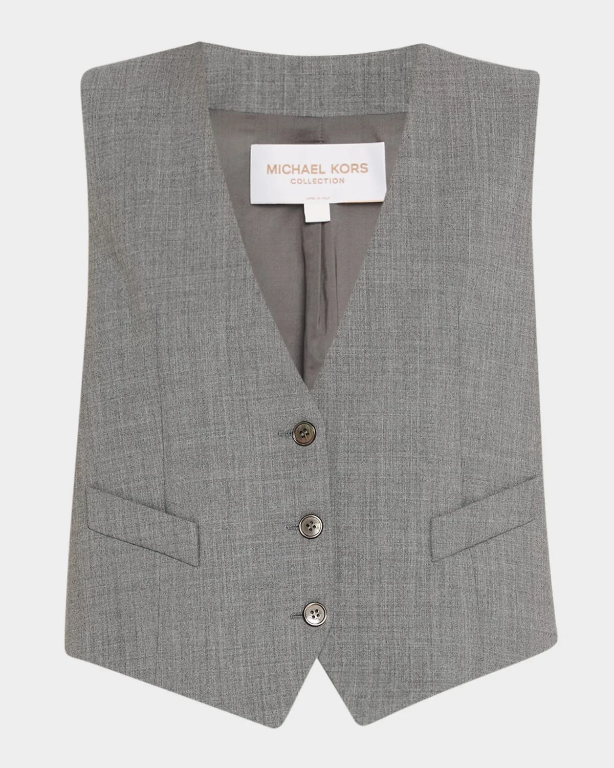 Michael Kors Collection cropped vest in a stretch wool V neckline; single-breasted front Sleeveless Hip welt pockets Straight fit Hip length Virgin wool/elastane Made in Italy