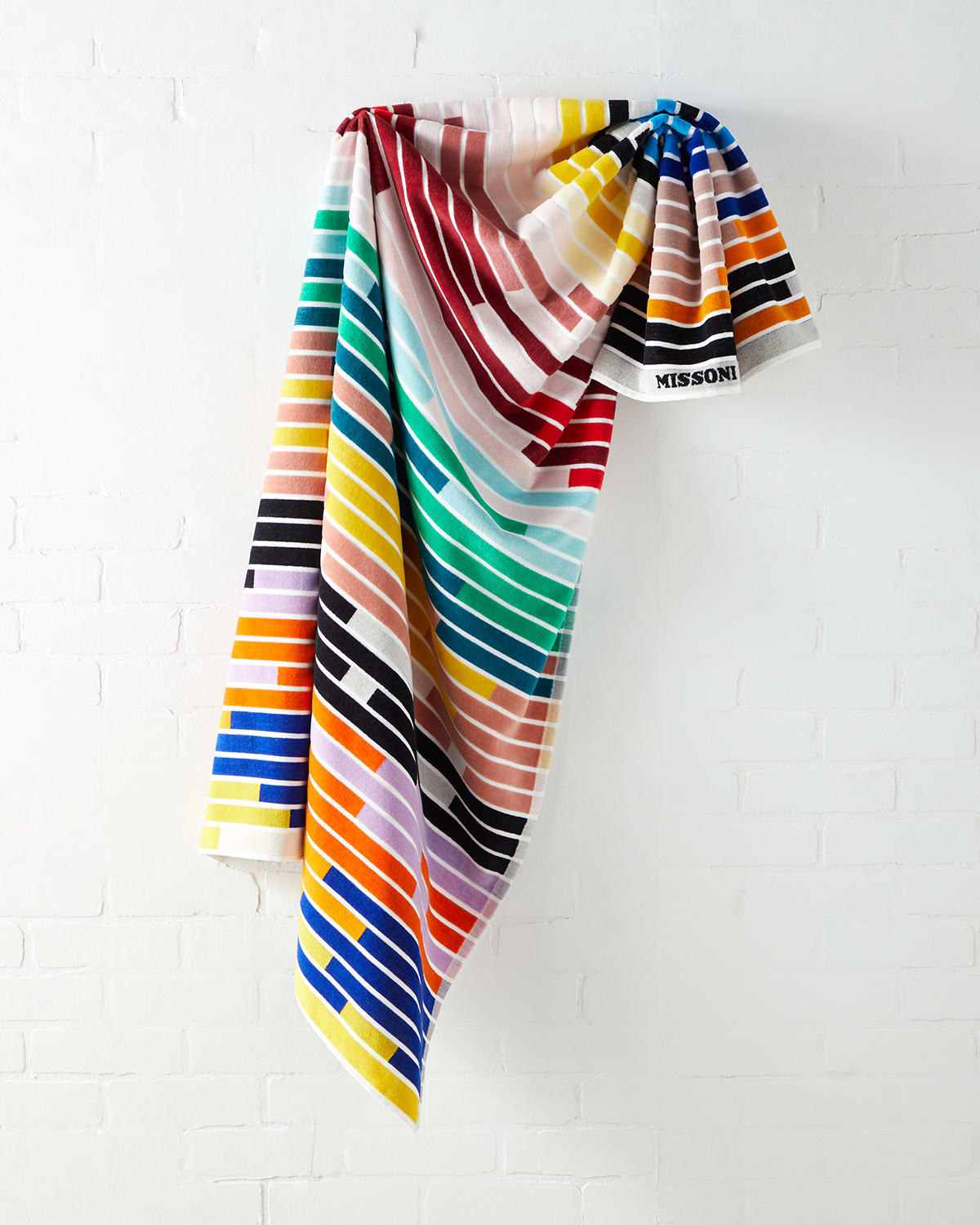 The Home Collection is one of the main expressions of the Missoni spirit. A perfect harmony between the person and the environment with textile elements to wear and furnishings to decorate. Colors and patterns dress up the house, making every space dynamic and original, discover all the proposals. Multistriped terry cloth beach towel 39" x 71" Cotton Machine wash cold, tumble dry low, do not bleach Made in Portugal