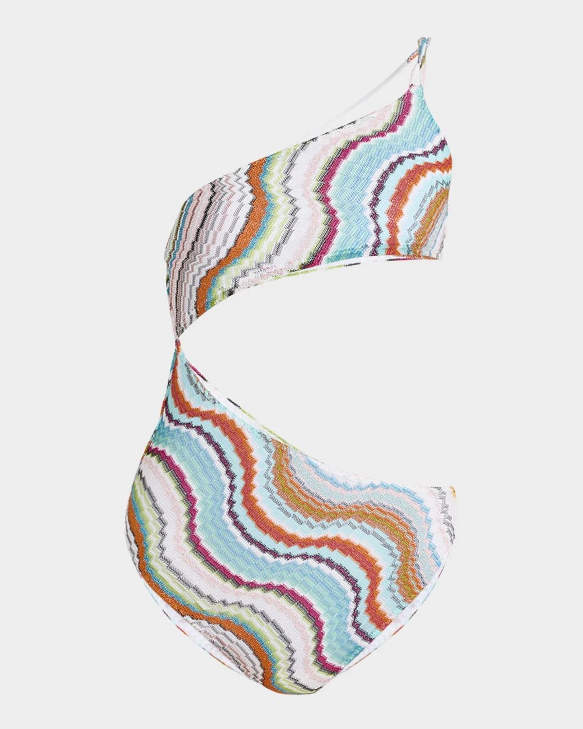 - Missoni one-piece swimsuit in a multicolor wave design - One-shoulder neckline - Strappy back detailing - Side cutout - Moderate seat coverage - Rayon/cellulose acetate/metallic fibers - Made in Italy - Model is 5'10"/177cm.