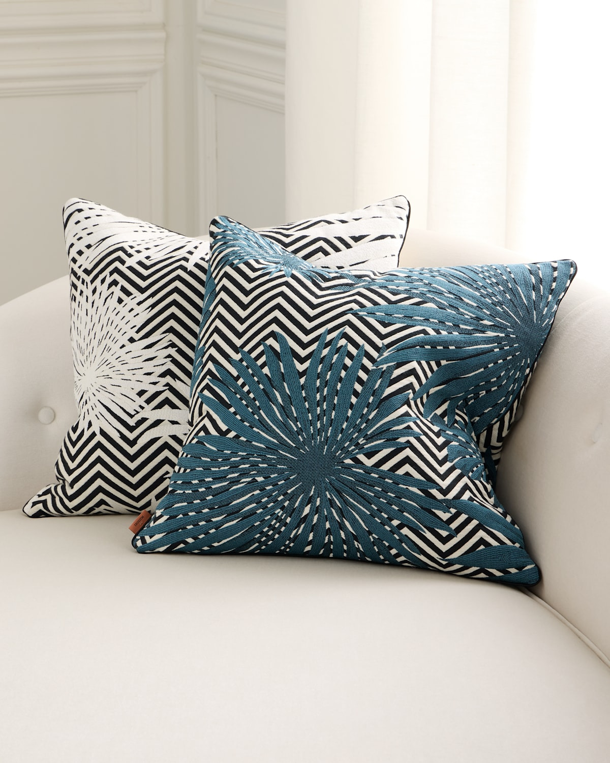 The Ombre Cushion is a captivating accessory that will enhance any sofa with embroidered leaf motifs on a black and white chevron background. Its versatile size and shape make it ideal for any seat or bed that needs extra support and comfort. Crafted of cotton, viscose, and polyester Goose feather/down fill Approx. 20"Sq. Item Weight (Lbs.): 1.2 For indoor use Professional cleaning recommended Made in Italy