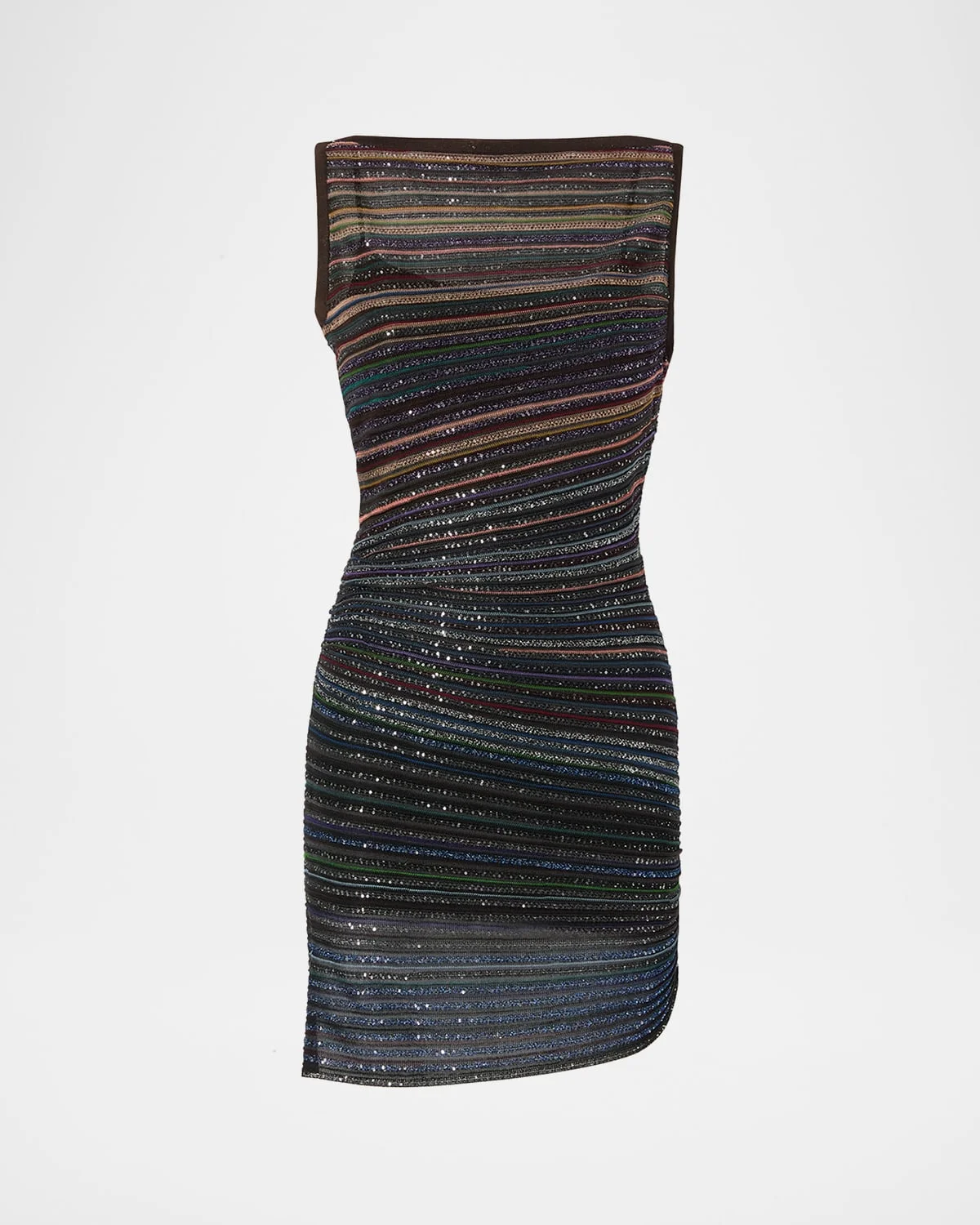 Missoni dress in sheer paillette diagonally striped knit High neckline Sleeveless Sheath silhouette Mini length Hidden closure Viscose/nylon/polyamide Made in Italy